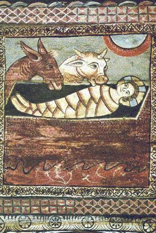 HET KIND IN DE KRIBBE: De oudst beqwaarde Romaanse schildering op een kerkplafond: St. Martinuskerk in Zillis, Zwitserland (1130).
